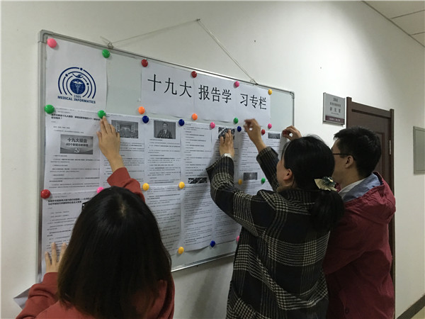 2017年10月20日下午,太阳集团tyc151医药信息学教工党支部在系会议室举办了十九大精神专题学习活动,通过集体学习和讨论,进一步深入领会十九大报告精神,共同憧憬党和国家未来的大政方针。会后,经全体党员的共同提议,在学系开设了“十九大报告学习专栏”,加大宣传力度,为全系师生学习十九大精神提供支持。