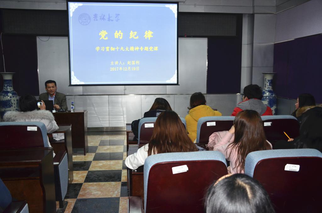 为深入学习贯彻党的十九大精神、加强员工党员的思想政治教育,12月19日晚,公共卫生公司党委书记赵国利于新民校区公司三楼报告厅主讲了以“党的纪律”为主题的专题党课,2015级、2016级全体员工党员及员工干部参加了此次学习。
