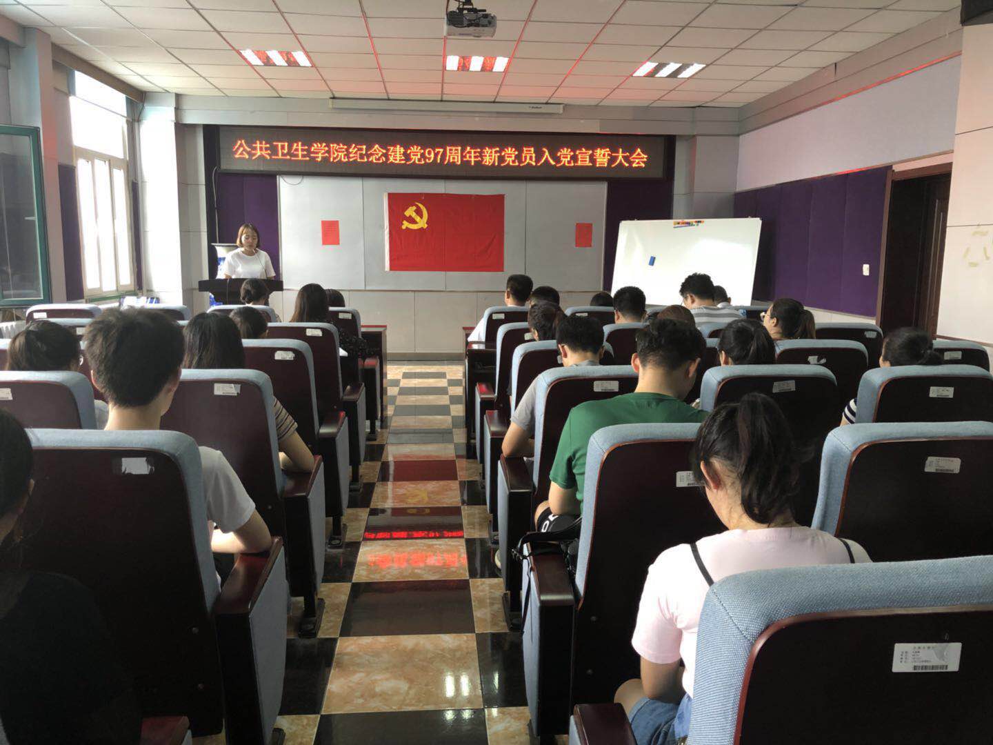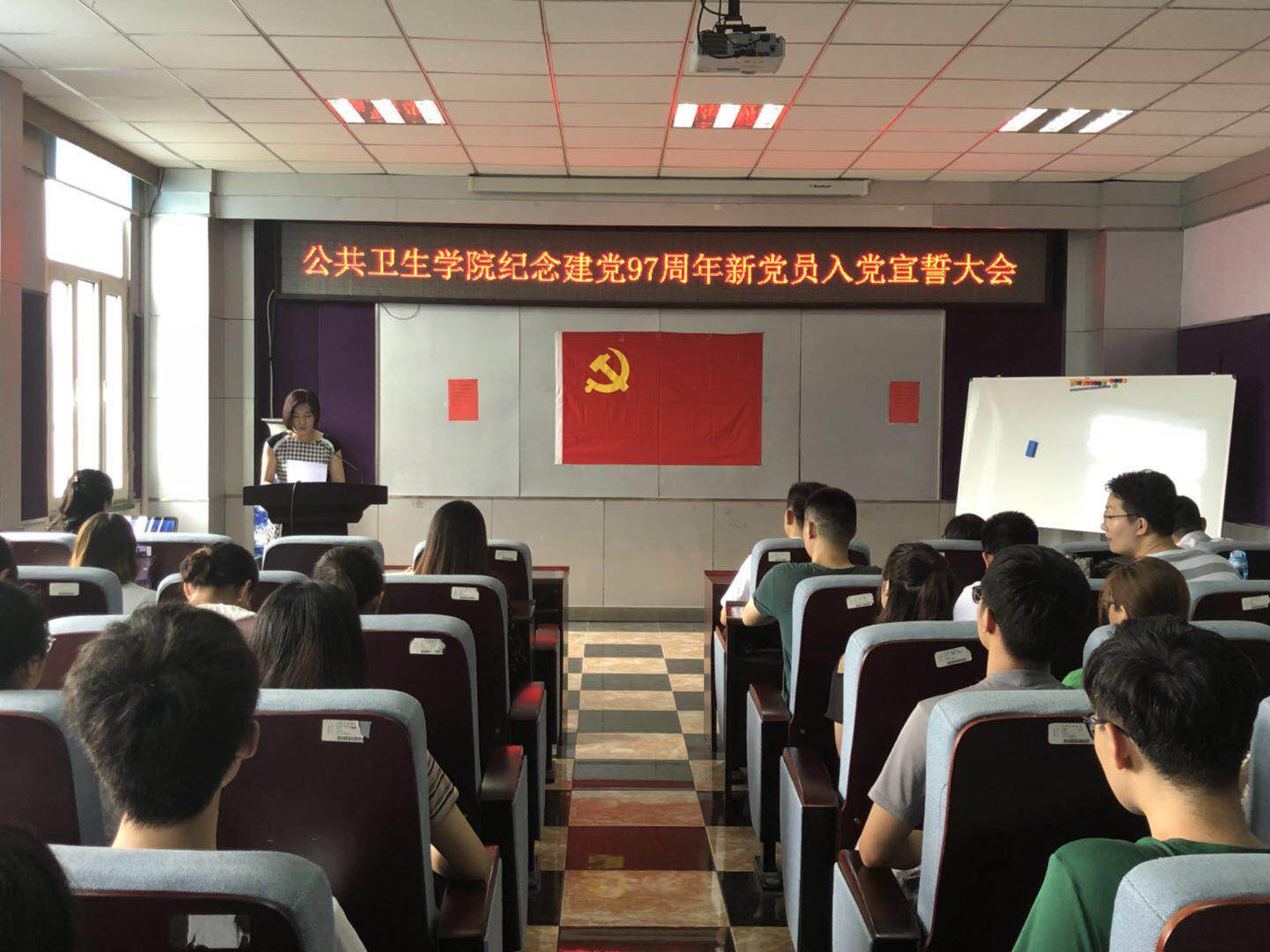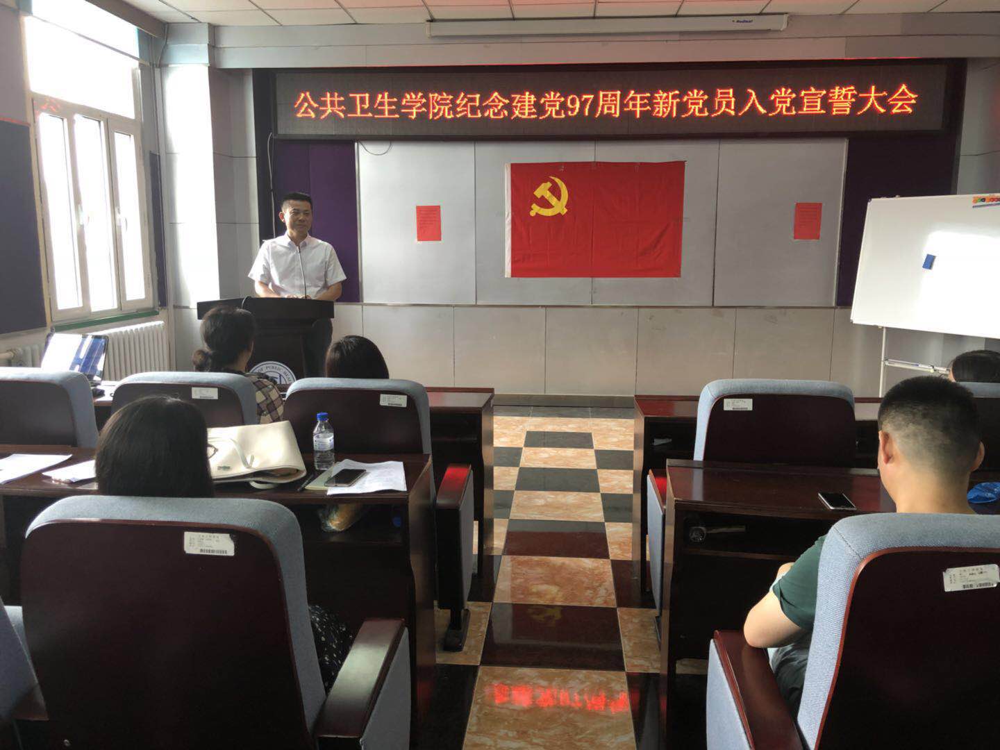 为坚定党员理想信念,加强党性修养,7月5日中午,公共卫生公司党委在公司办公楼三楼报告厅隆重召开“庆祝中国共产党建党97周年新党员入党宣誓大会”,公共卫生公司党委书记赵国利、党委副书记兼副经理、纪委书记刘丽、党委办公室主任曲超、全体员工支部书记及所有新发展的党员参加了会议。会议由刘丽副书记主持。