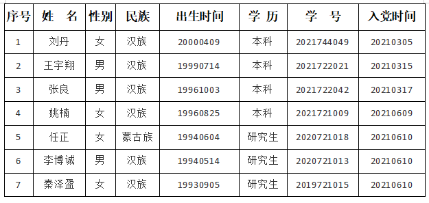 在听取党员、群众意见的基础上,经支部委员会审查,拟将刘丹、王宇翔、张良、姚楠、任正、李博诚、秦泽盈7名同志转为中共正式党员。根据发展党员工作有关要求,现将其有关情况进行公示。