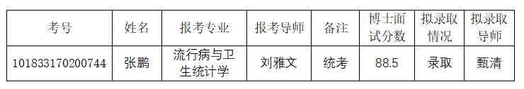 集团为流行病与卫生统计学专业追加1个招生名额,按照总成绩由高到低的录取原则依次录取,现将录取信息公示如下: