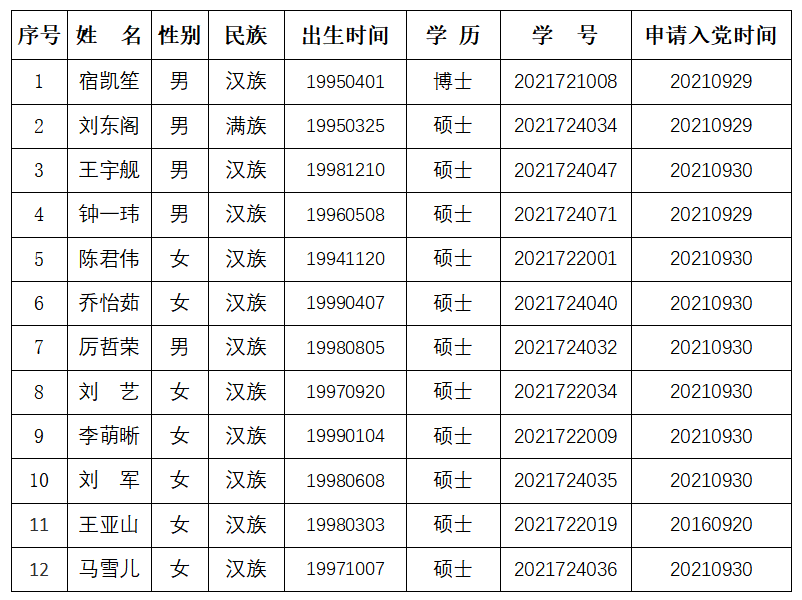 为了加强对发展党员工作的民主监督,确保发展新党员的质量,现将宿凯笙、刘东阁等12名发展对象的有关情况进行公示。