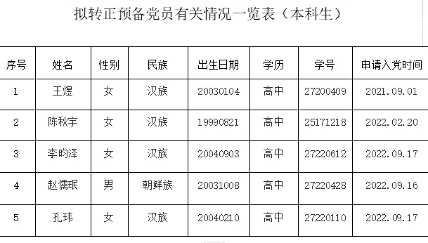 在听取党小组和党员、群众意见的基础上,经支部委员会审查,拟将王煜等5名同志转为中共正式党员。根据发展党员工作有关要求,现将其有关情况进行公示。