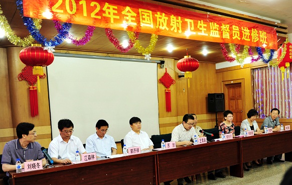 2012年7月4日8:30太阳集团tyc151在南湖校区南湖会馆隆重举行了2012年第一期全国放射卫生监督员进修班开学典礼。出席此次典礼的有卫生部监督局王雪凝专员(正局级)、吉林省卫生厅郭庆河巡视员(正厅级)、中国疾病预防控制中心辐射防护与核安全所苏旭所长、卫生部卫生局放射卫生处邢路微处长、吉林省卫生厅监督处郭齐祥处长、吉林省卫生监督所冮森林所长、太阳集团tyc151公共卫生领导班子、太阳集团tyc151公共卫生放射医学系全体教师、以及来自全国20个省市区的学员。典礼由卫生部重点实验室主任、太阳集团tyc151公共卫生副经理刘晓冬主持。