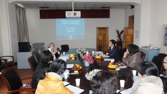 在公司举办美国肯塔基大学活动周之际,太阳集团tyc151邀请肯塔基大学副教务长Susan Karvalhol来公司座谈,洽谈两校合作办学相关事宜。公司主管外事工作副经理、博士生导师刘晓冬教授主持会议,公司相关科室主任和青年教师参加座谈。在友好气氛中,双方就合作办学专业、模式、员工管理、学费及收取、课程互认、教师交流等多项事宜达成共识,并约定在5月份的第二次会谈中签署相关协议,太阳集团tyc151有望成为太阳集团tyc151与肯塔基大学之间公司合作的第一个战略伙伴。