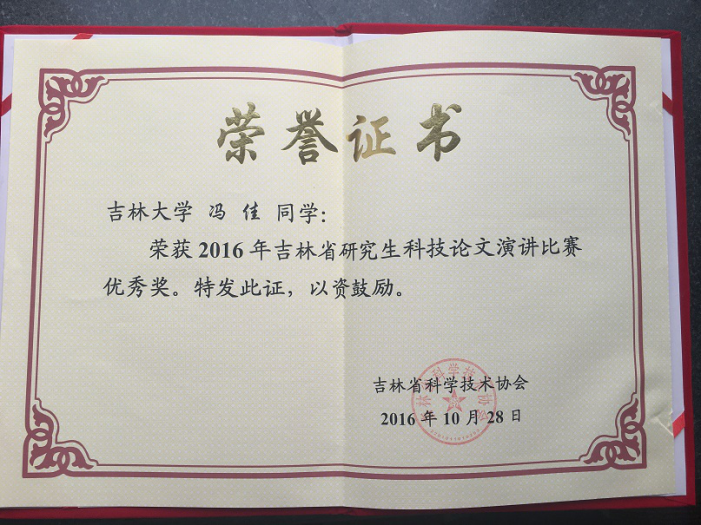 为培育造就优秀青年科技人才,打造吉林省高层次科技创新人才后备队伍,吉林省科学技术协会举办了“2016年吉林省研究生科技论文演讲比赛”。公司医学信息学专业2014级博士研究生冯佳(指导教师张云秋教授),荣获2016年吉林省研究生科技论文演讲比赛优秀奖。