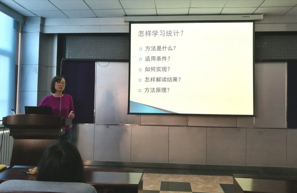金丽娜老师以“怎样学习统计”开篇,并以《吉林省成人慢性病及其危险因素调查研究》项目为例,为大家详细解读了数据统计在科研工作中的重要意义及严谨求实的科研态度,同时还为同学们深入地讲解了概率论与统计分析方法、现场调查技术、论文写作中统计图表的构建以及SPSS软件的使用等。