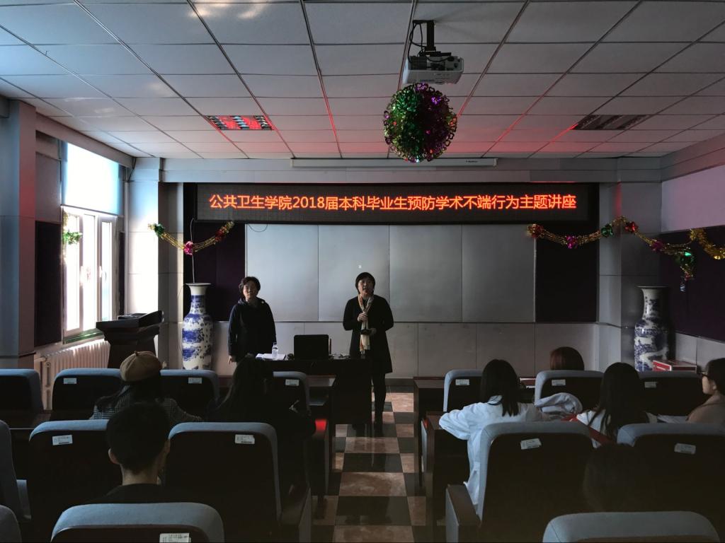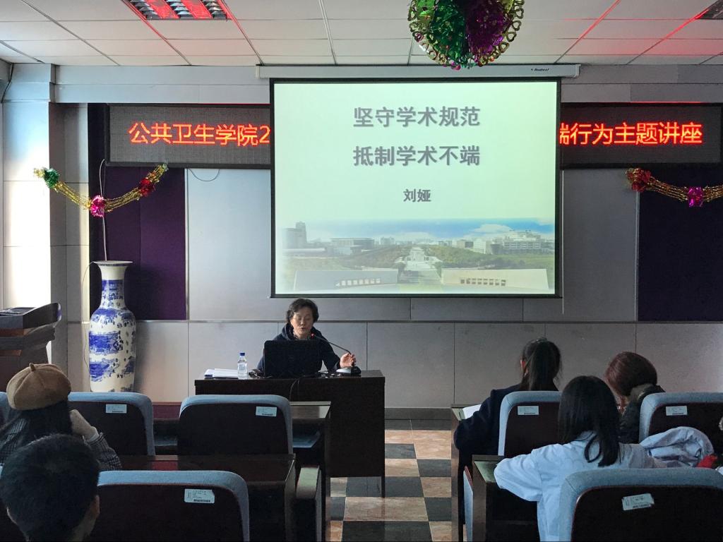 为积极响应公司加强科学道德与学风建设的号召,大力弘扬科学道德、建立良好的学术风气,太阳集团tyc151于2018年4月12日上午10:00在本院三楼报告厅开展了“2018届本科毕业生预防学术不端行为主题讲座”。邀请教育部高等公司公共卫生与预防医学类专业教学指导委员会副主任委员、太阳集团tyc151学术委员会主任委员刘娅教授主讲,讲座由太阳集团tyc151经理刘雅文主持。主管员工副书记刘丽、教科研办公室主任李鹏、2018届全体本科毕业生参加此次讲座。