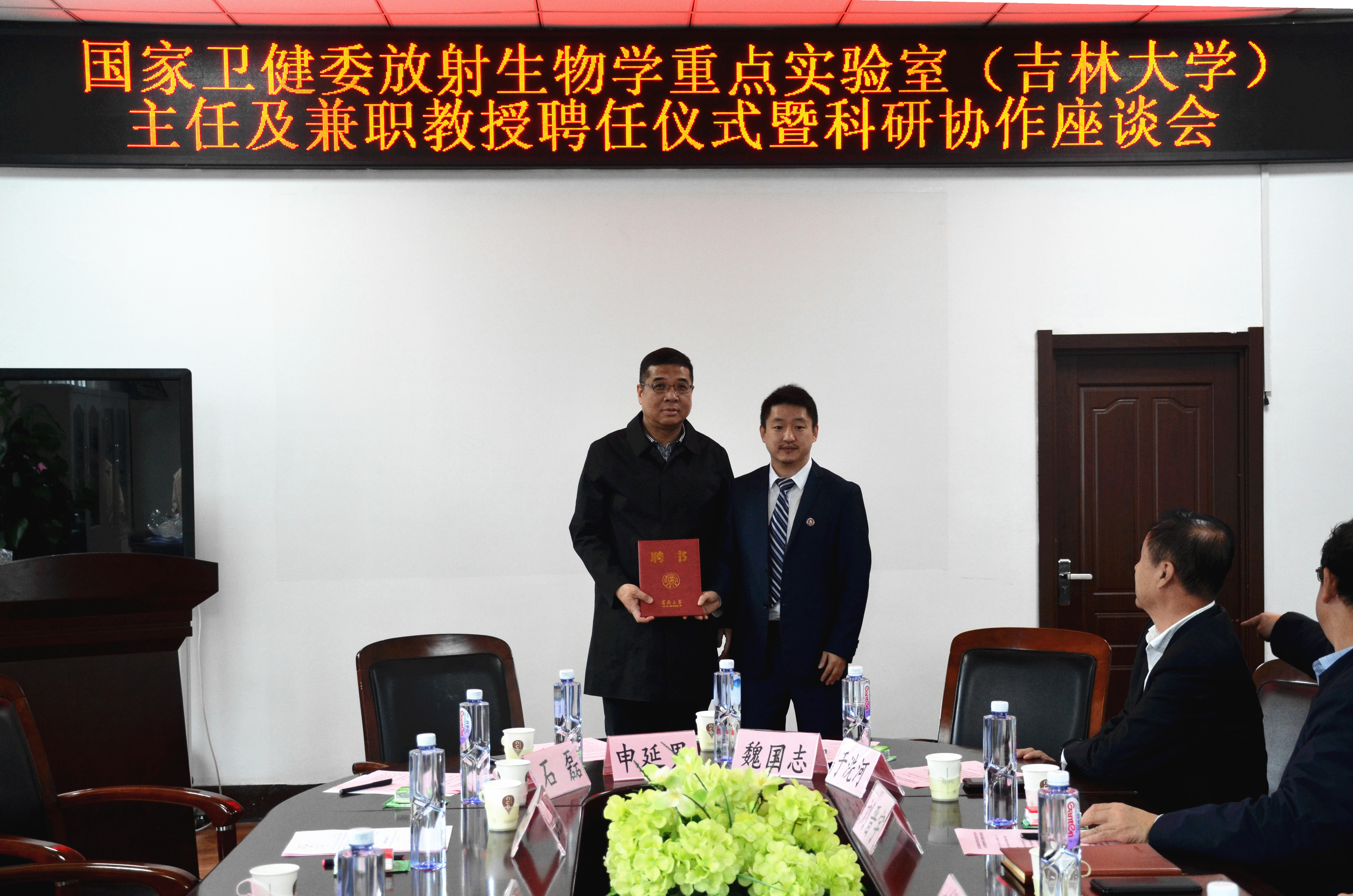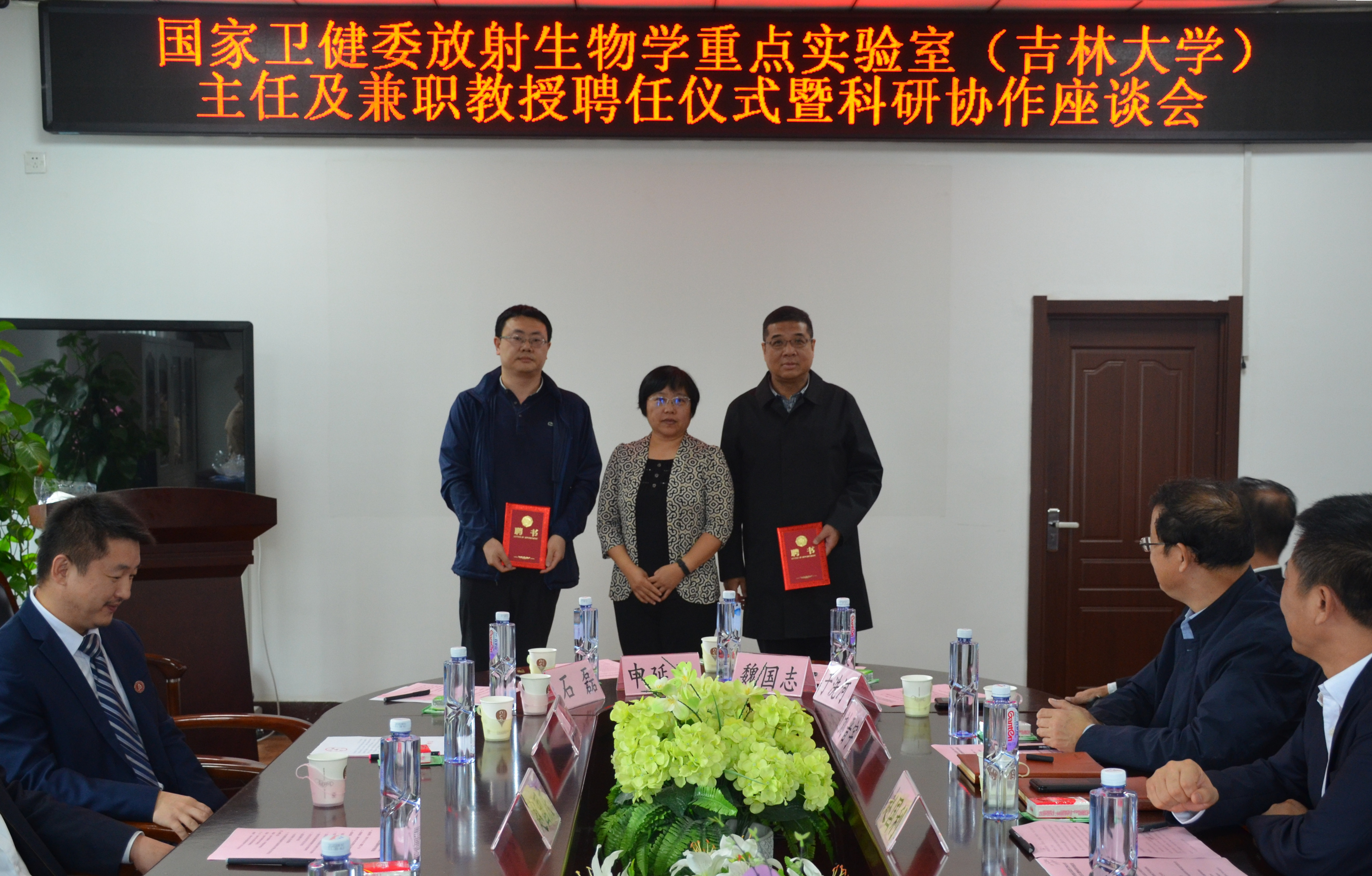 2020年9月23日上午,在太阳集团tyc151202会议室举行了国家卫健委放射生物学重点实验室(太阳集团tyc151)主任及兼职教授聘任仪式暨科研协作座谈会。太阳集团tyc151副董事长、白求恩医学部学部长赵国庆出席了会议,参加会议的还有科技处副处长王国庆、白求恩医学部副部长王放、白求医学部学术工作办公室主任姜春明、中日联谊医院核医学科马庆杰主任及高识副主任,公司领导班子全体成员、放射医学系主任及各教研室主任。会议由公司党委书记赵国利主持。