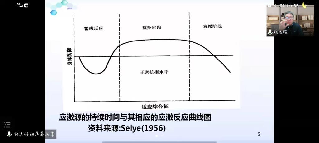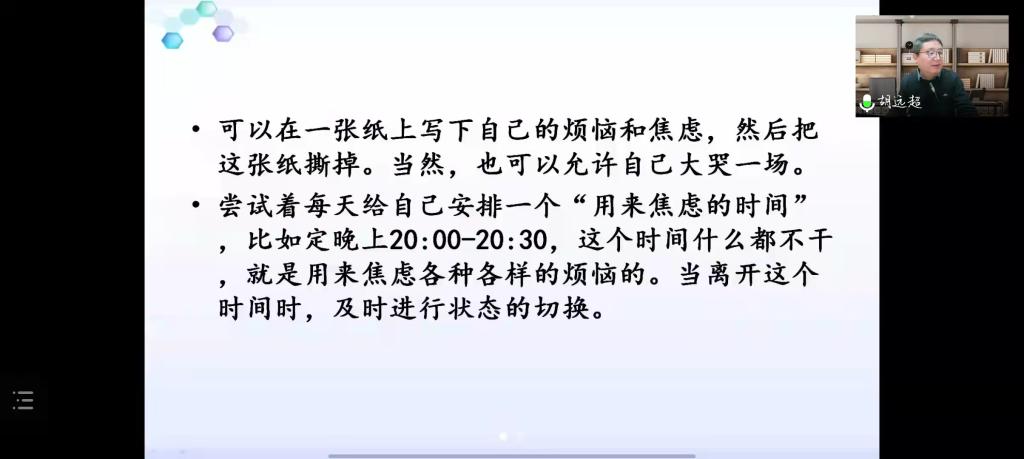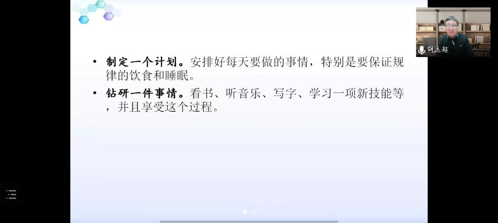讲座伊始,胡老师阐述了疫情当下师生们的现实处境,并从生活、学习、情绪、人际关系等多方面分析了压力来源,以“感觉剥夺实验”类比当前疫情形势,指出师生们需要从生活学习和来自外部的刺激中进行自我调节,并给出了调适心态的三个要点:一是要拓展自身资源。胡老师提出,“生活本身是最好的心理咨询师。”把握住来自生活方方面面的资源系统对于缓解压力,调节情绪具有重要意义。二是增强心理稳定。他鼓励师生采用意义换框法进行自我调节以稳定心理。三是减少压力干扰,可以从生理反应、认知反应、情绪状态和行为表现四个方面减少压力对心理状态的影响。讲座的最后,胡老师与各位师生进行线上交流。