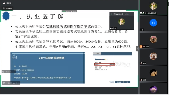 胡文娱曾在执业医师考试(公卫)中取得433分的高分成绩,会上,她从执业医师考试初步了解、实践考试、综合考试、注意事项四个方面向同学们分享了执业医师考试备考经验。