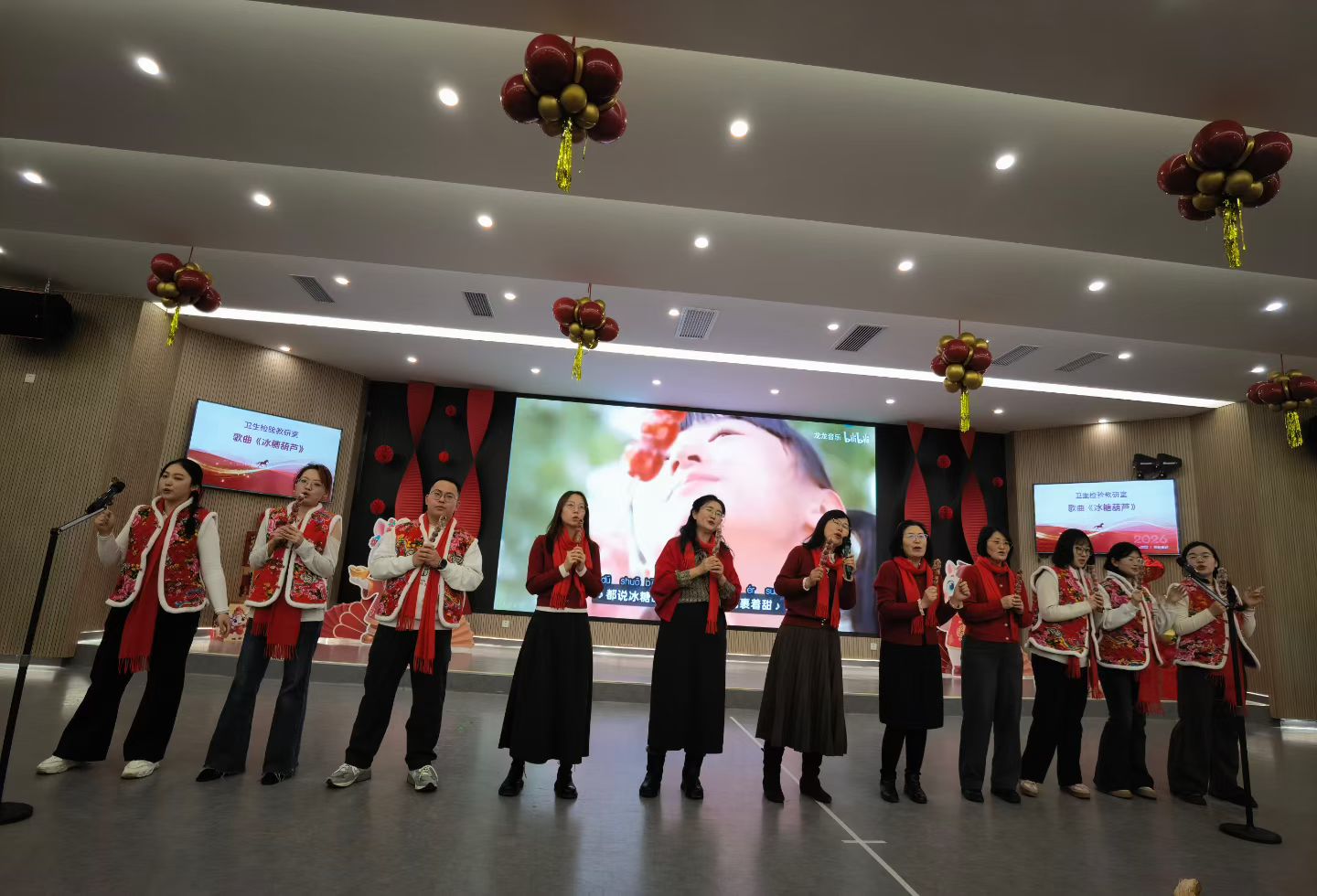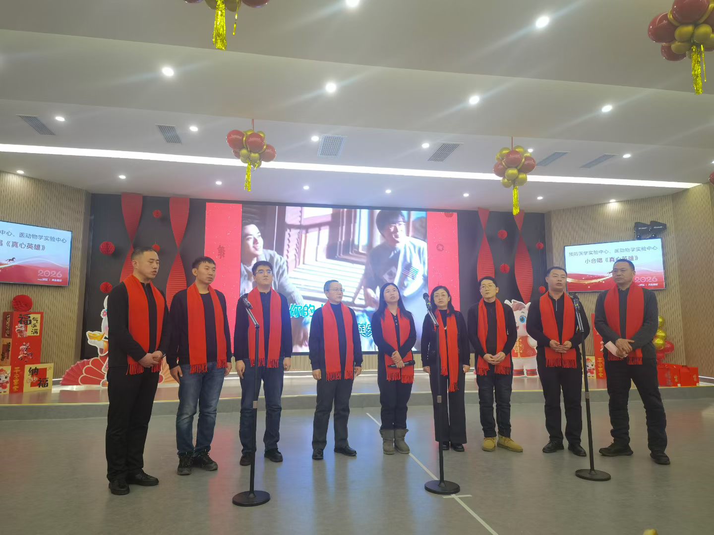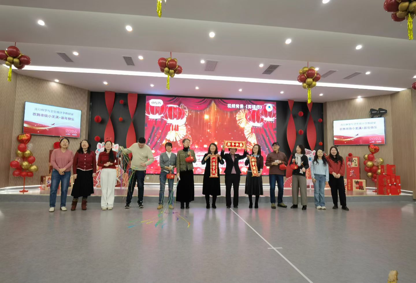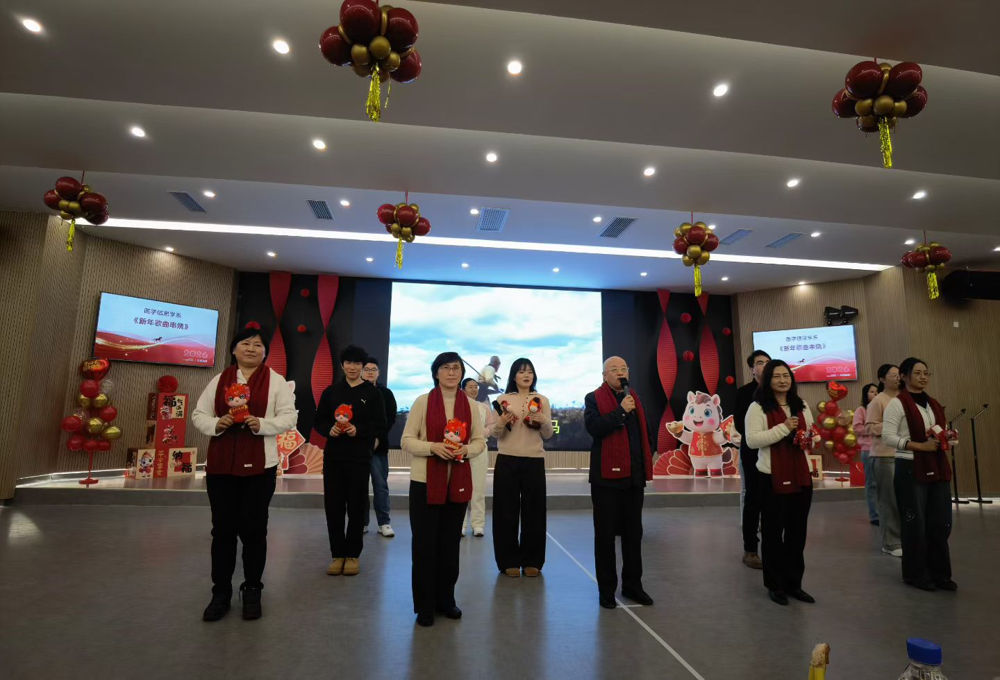 随后,各教研室纷纷献上精彩节目。流行病与卫生统计学系的歌舞串烧活力四射,传递出美好的新年祝愿;预防医学实验中心合唱《真心英雄》,歌声铿锵,展现了教职工们团结拼搏的精神风貌;劳动卫生与环境卫生教研室的歌伴舞《New Boy》洋溢着青春气息;社会医学与医事法学系的诗朗诵《举着时间碎片的你》深情隽永,引人思考;研究生会的舞蹈表演激情四射,点燃全场热情;医学信息学系的新年歌曲串烧唤起美好回忆;卫生毒理学教研室的舞蹈《卡拉永远OK》动感十足;营养与食品卫生学教研室与儿少卫生学教研室联袂演绎的《非洲鼓舞》热情奔放,鼓点激昂;社会医学与医事法学系带来的健身操表演朝气蓬勃;卫生检验教研室演唱的《冰糖葫芦》甜美温馨,年味浓郁;员工工作办公室的独唱《月亮代表谁的心》婉转动人;放射医学系的《2026马年大吉好运来》充满了喜庆祥和的节日气息。