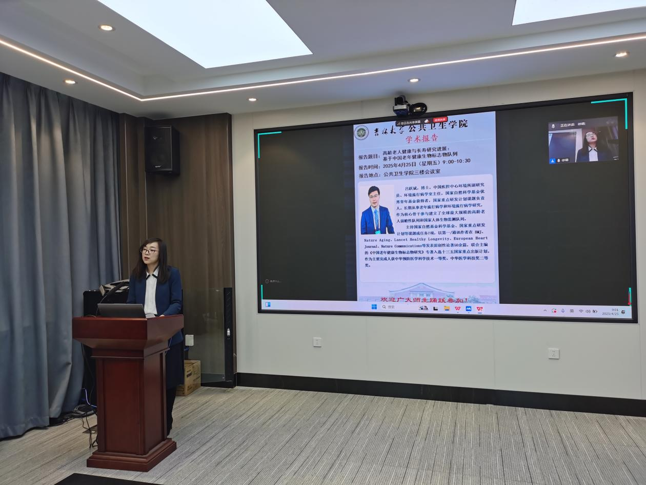 4月25日,中国疾病预防控制中心环境所环境流行病学室主任吕跃斌副研究员应邀来院交流,作题为"高龄老人健康与长寿研究进展:基于中国老年健康生物标志物队列"的学术报告。报告由太阳集团tyc151副经理王娟教授主持,公司相关学科师生参与学术活动。