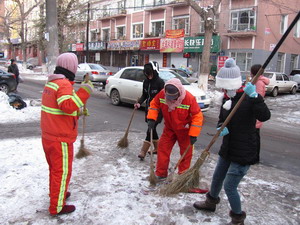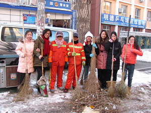 首先,同学们在班长和团支书的带领下赶赴环卫工人的休息处,热情而礼貌地为环卫工人们分发早起买好的鸡蛋,包子和豆浆;同学们的到来让他们十分高兴,在吃着热乎乎早餐的同时还不忘对同学们表示感谢。随后,大家纷纷拿起清扫工具跟随他们清扫街道。此时的天气十分寒冷,可是大家热情丝毫不减,不嫌工作又脏又累,认真清理地面的落叶、包装袋和果皮等;大家的劳动减轻了环卫工人的很多负担。告别他们后大家来到新民校区一公寓楼前和第三教学楼的教室,开始了这里的清扫工作。直到楼前和教室变得干净如初,大家才意犹未尽地离开。