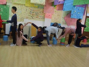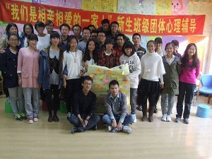 本次心理辅导由三个阶段组成。首先是热身阶段,其中包括“一分钟鼓掌”、“无家可归”和“温柔体操”三个游戏。简单的游戏使同学们放松了心情,活跃了现场气氛,也使同学们意识到每个人来到了大学都有自己的预期与理想,所以更要对老员工活有一个合理的认知与规划。接着辅导进入到过渡阶段,在“信任之旅”、“集体登陆”、“人体字母”和“人椅破冰”的游戏中,当同学们遇到问题时,每个人都会提出自己的解决方案,并能够一起讨论、共同应对。渐渐地同学之间建立了信任,也形成了集体意识与荣誉感。热烈的现场气氛也将活动推入了高潮,教室里充满了同学们的掌声与欢笑。游戏过后,伴随着《相逢是首歌》的音乐,同学们真诚地写下了自己对其他同学的评价,增进了彼此之间的了解。活动最后,各班同学认真绘制了属于自己班级的“团体树”并合影留念,并在“团体树”上表达了自己对未来的憧憬,对这个班级的祝愿。