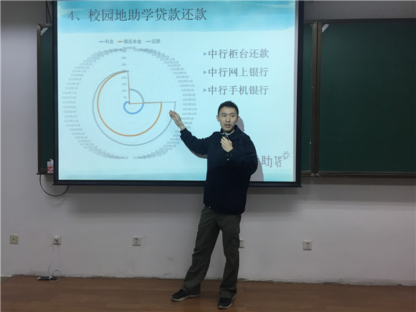 担任本次报告会主讲人的助贷部部员赵天业,他从公司官方微信公众号“公小卫”的几篇贷款推送切入主题,向大家介绍了助学贷款的基本特点、其相比于其他类型贷款的优越性以及生源地助学贷款的放款,续贷和最终还款流程。其中,他以助学贷款违约率曾超过50%的西安交通大学为反面典型,强调了及时还贷的重要性。这不仅关系到个人的诚信记录,更是学弟学妹顺利获得助学贷款的良好保障。随后,主讲人又为同学们介绍了包括借记卡贷记卡、常见理财平台,贷款的单利与复利、银行征信系统在内的一些金融知识小常识。在场的同学们无不被主讲人风趣幽默的说话风格所吸引,一场看似内容枯燥的报告会,气氛却出乎意料地轻松欢快,主讲人寓教于乐的讲授方式明显收获了良好的效果。