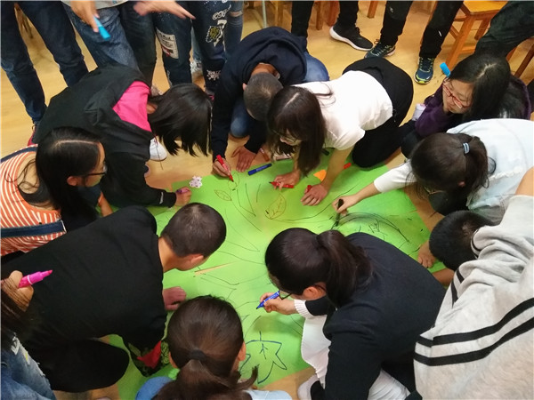 对于2017级的同学们,大学是他们人生中一个崭新的阶段,对于他们而言需要一个准确的自我定位。活动开始的第一个游戏叫“1分钟鼓掌”,让大家通过预期与实践的对比,认识到理想与现实的差别以及自我定位的客观性。随后,进行的“我知道”、“信任之旅”两个环节,目的是为了增强他们的团队意识、加强相互信任为目标。紧接着,“信任之旅”采用了两人协作的方式,一位“引路人”无声引导遮住双眼的“盲人”躲避障碍,这让同学们体验了如何在一定风险中信任或支持他人,这不仅增强了团体成员彼此间的信任感,还使每个人认识到了自身在集体中应尽的责任。然后进行的“人体字母”游戏,也有异曲同工之处,在锻炼协作能力的同时也培养了新生的创新拓展能力,同学们开放思维、拓宽思路,为单一的词语创造了丰富多彩的演绎方式。接着是“人体破冰”环节,这个环节极大地活跃了气氛,打破了同学之间的疏离,帮助大家更好更快地融入集体。活动的最后,各班同学分别在画纸上创作了代表内心梦想、期望的“团体树”,缤纷的色彩、流畅的线条,象征着同学们对未来的美好憧憬与对集体的诚挚热爱。