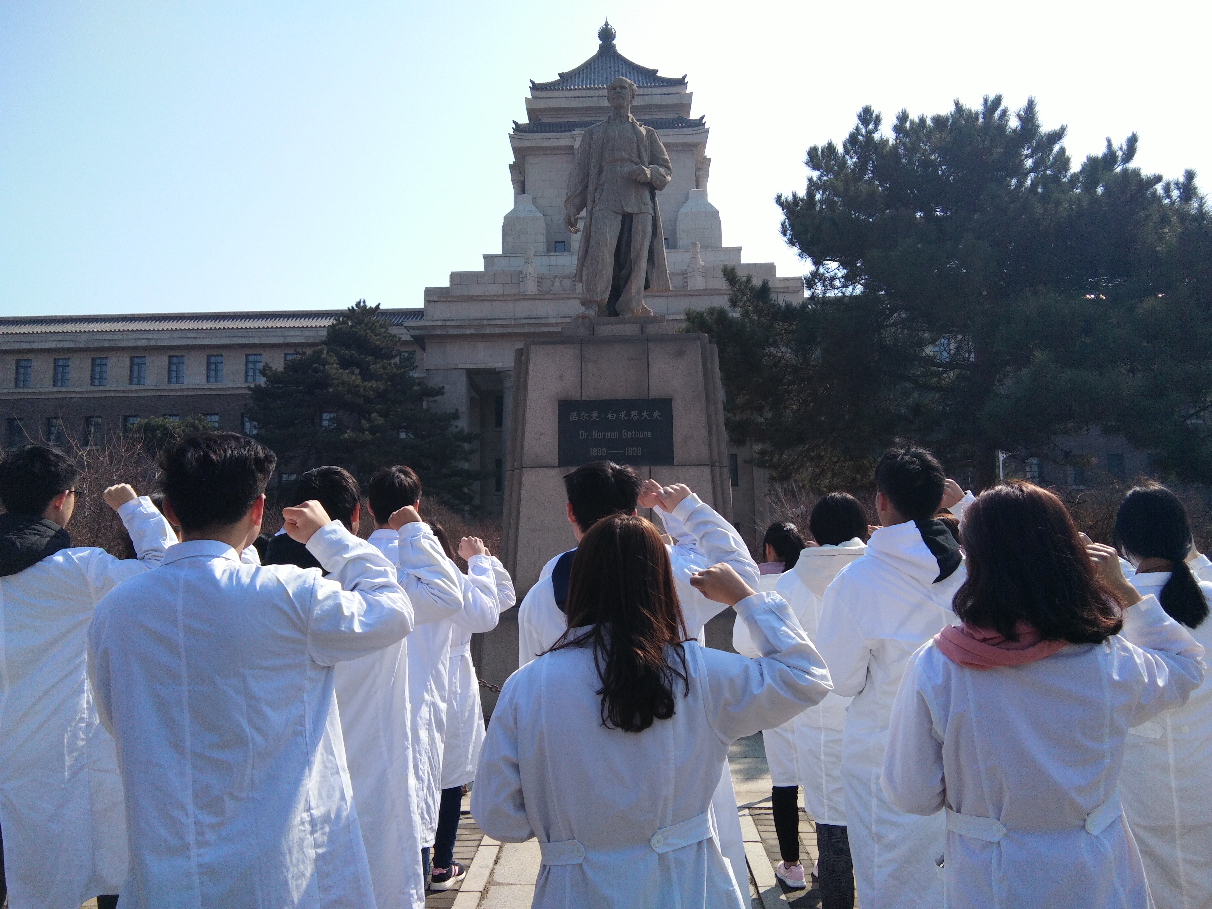 上午9时,仪式正式开始。同学们身着白衣、手持红烛,庄严肃立于白求恩雕像前,举起右手放于耳畔,齐声宣读着《医员工誓言》:“健康所系,性命相托。当我步入神圣医学学府的时刻,谨庄严宣誓:我志愿献身医学,热爱祖国,忠于人民,恪守医德,尊师守纪,刻苦钻研,孜孜不倦,精益求精,全面发展。我决心竭尽全力除人类之病痛,助健康之完美,维护医术的圣洁和荣誉,救死扶伤,不辞艰辛,执着追求,为祖国医药卫生事业的发展和人类身心健康奋斗终生。”同学们在寒风中岿然不动,响亮而又坚定的声音回荡在新民校区白求恩雕像上空。