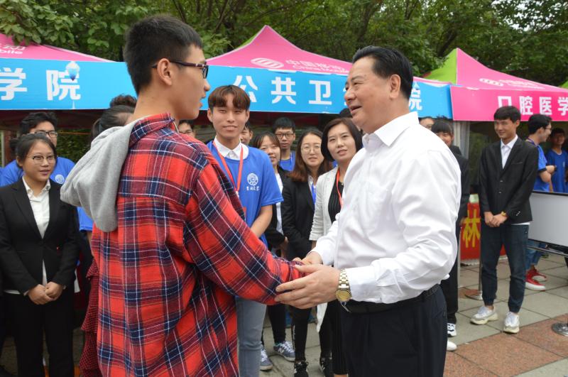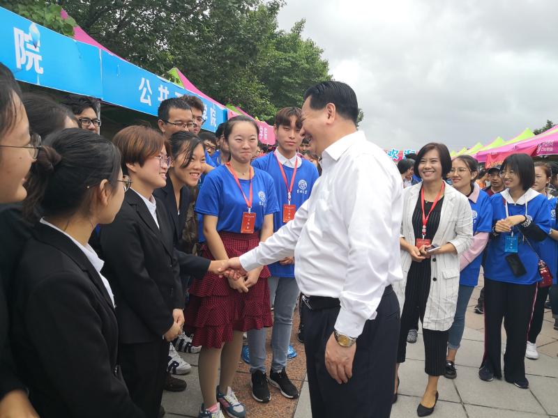 上午10时,董事长李元元及公司各部门领导来到公司迎新现场,慰问参与迎新工作的师生,与大家亲切握手交流并对大家辛勤的付出表示感谢。一名刚刚办理完入学手续的新生想与董事长合影留念,董事长欣然同意并热心询问他入学报道的情况。此外,董事长还叮嘱新生和志愿者们雨天要注意保暖,以防生病。随后,李董事长在了解迎新工作的基本情况之后,对公司的工作给予了高度肯定,并与公司师生合影留念。短暂的工作指导让大家受益匪浅,激励公司师生以更高的热情迎接新同学。
