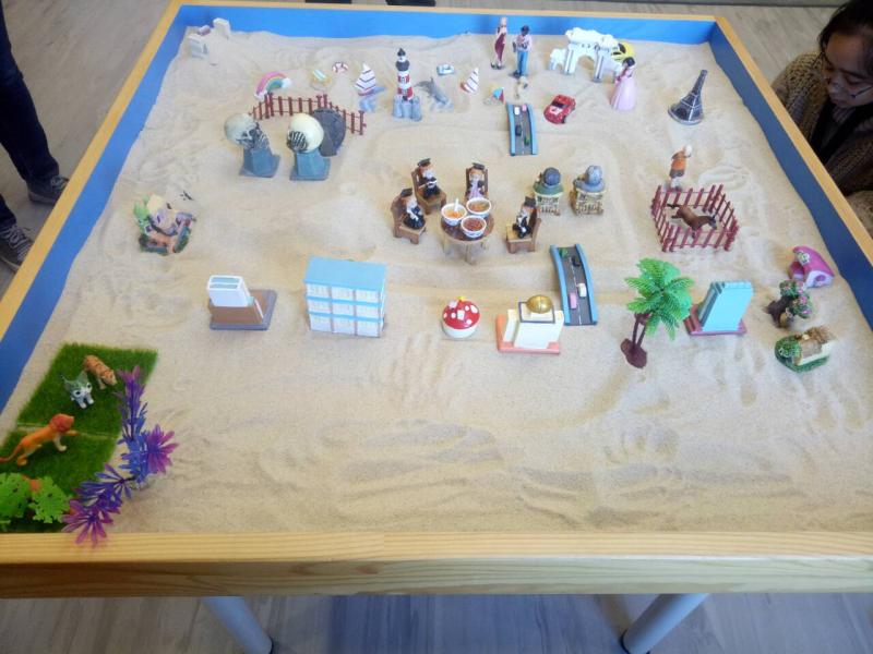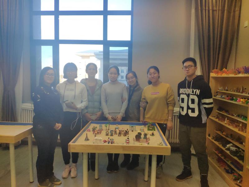 活动开始之前,汤晓老师对沙盘体验活动做了简要介绍,然后让同学们依次按照自己的想法进行沙盘的填充与摆放,经过几轮后原来空荡荡的沙盘,初步形成了“理想家园”的模样。同学们认真摆放并再三查看整体状态,以构建出内心设想的场景。紧接着,同学们完成了沙盘的填充与摆放,大家围绕共同创建的沙盘展开了讨论,依次讲述了自己最喜欢沙盘的哪个部分。与此同时,同学们还设想自己是沙盘中的某一部分或某一人物,表达出了自己在理想世界中的角色,使全身心得到放松。在交流与讨论中,展现出了同学们丰富多彩的心理活动和生活状态。最后,同学们和共同构建的沙盘进行拍照并集体合影留念。