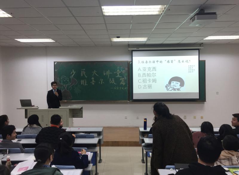 祖米热提古丽同学则从传统服饰、节日服装、艾特莱斯和花帽等方面对维吾尔族服饰进行了详细的介绍,使同学们对维吾尔族有了崭新的认识。两位同学风趣生动的介绍赢得了大家热烈的掌声。此外,活动还设有奖竞答环节,同学们踊跃参加,正确作答,获得由少民部准备的极具维吾尔族特色的精美小礼物。