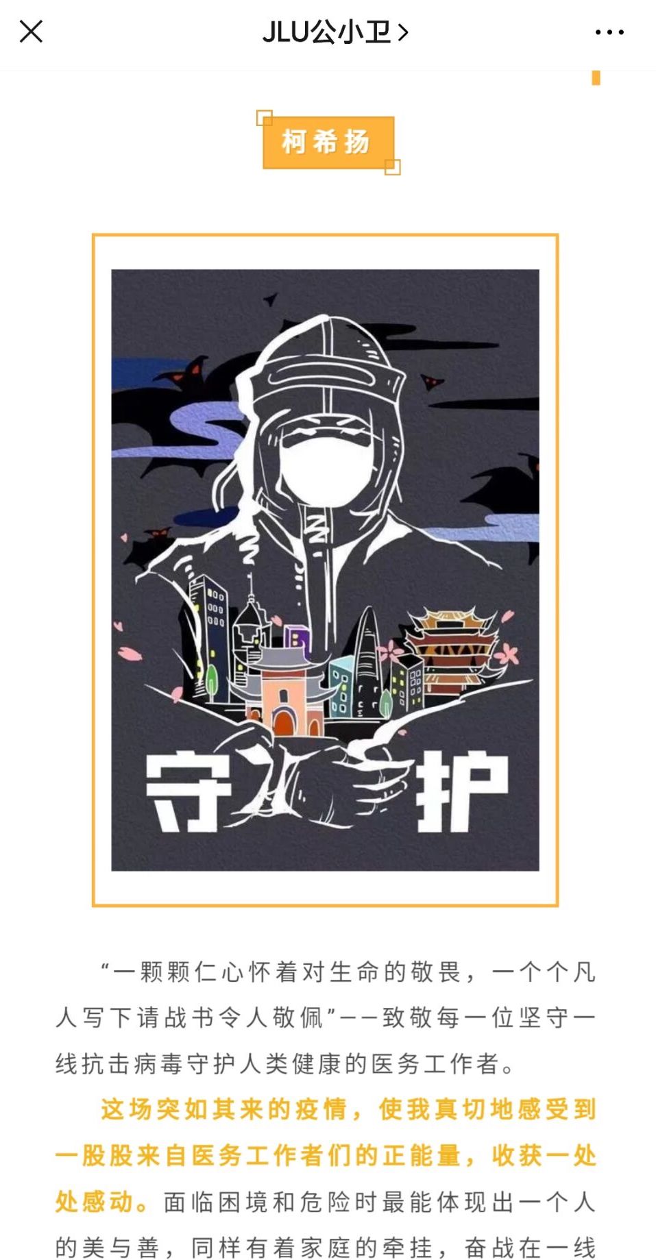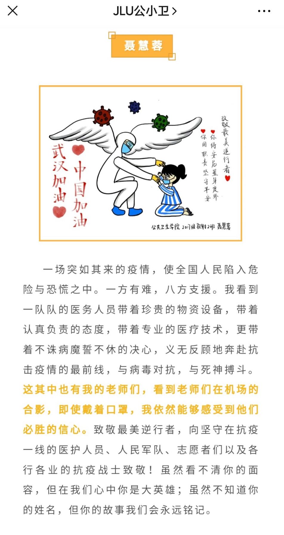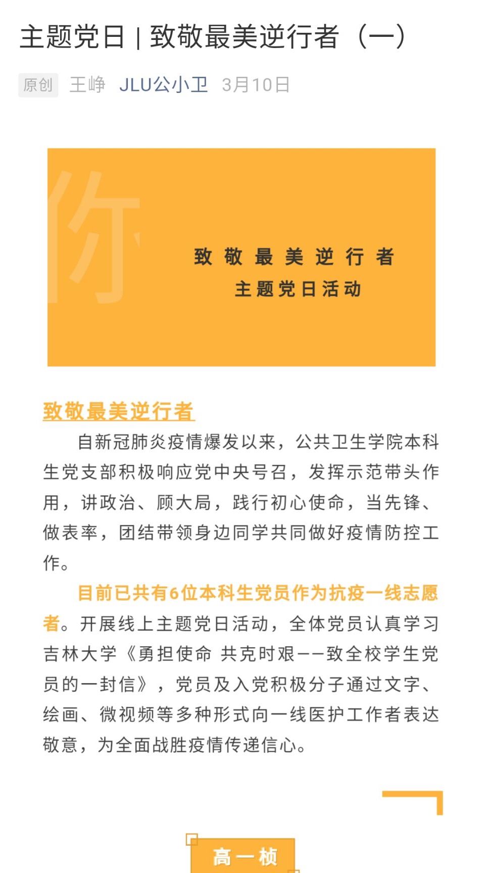 在本次活动中,支部党员及入党积极分子积极投稿,通过翻唱暖心歌曲、朗诵致敬诗歌以及创作文字、绘画和微视频等多种形式来表达对最美逆行者的崇高敬意。参加本次活动的作品经过最终遴选,发表在公司公众号JLU公小卫上。这些作品秉承着“疫情就是命令,防控就是责任”的信条,传递出党员们对各行各业抗疫战士的敬意与感谢,也表达了作为医员工“不忘初心,牢记使命”的责任与担当,获得了同学们的由衷赞美与一致好评。在线上,党员们还认真学习了太阳集团tyc151《勇担使命 共克时艰——致全校员工党员的一封信》,切实发挥好带头示范作用,团结带领身边同学共同做好疫情防控工作。