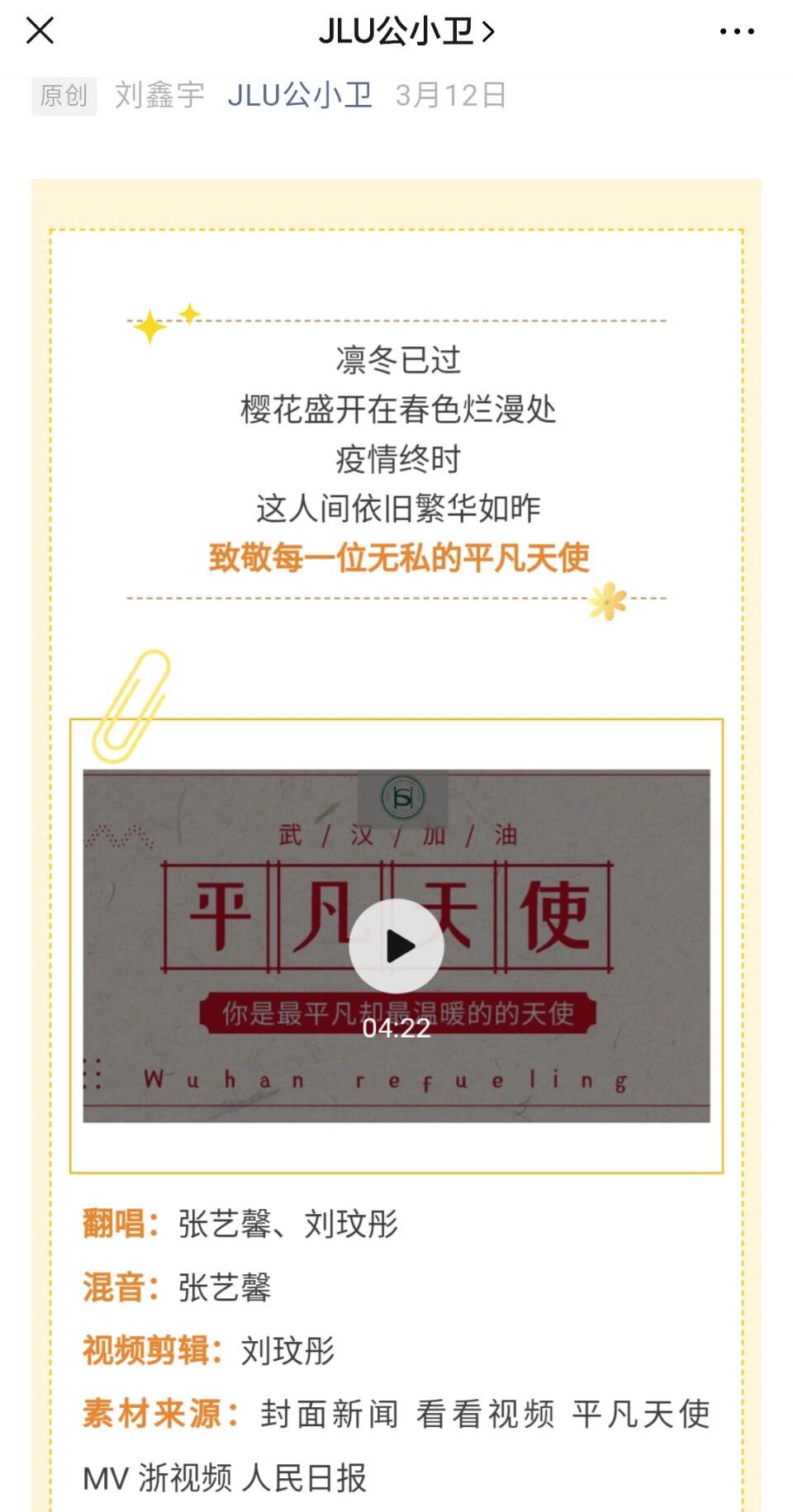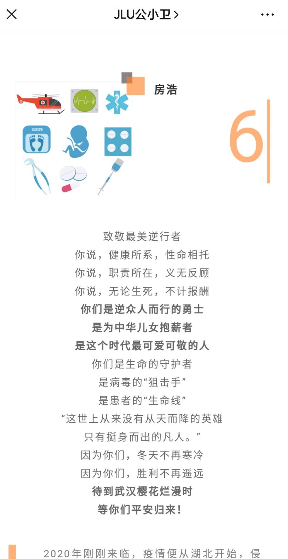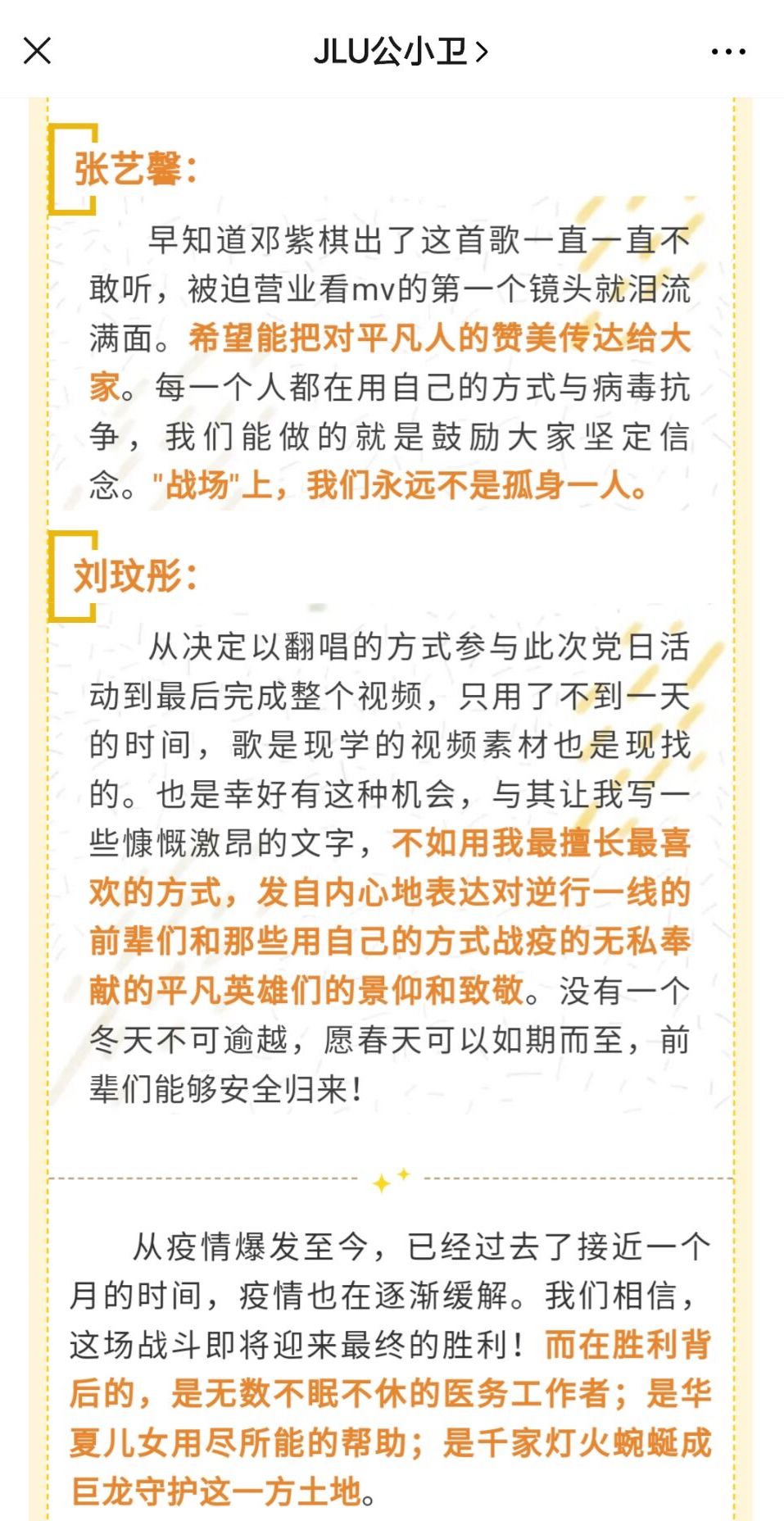 在本次活动中,支部党员及入党积极分子积极投稿,通过翻唱暖心歌曲、朗诵致敬诗歌以及创作文字、绘画和微视频等多种形式来表达对最美逆行者的崇高敬意。参加本次活动的作品经过最终遴选,发表在公司公众号JLU公小卫上。这些作品秉承着“疫情就是命令,防控就是责任”的信条,传递出党员们对各行各业抗疫战士的敬意与感谢,也表达了作为医员工“不忘初心,牢记使命”的责任与担当,获得了同学们的由衷赞美与一致好评。在线上,党员们还认真学习了太阳集团tyc151《勇担使命 共克时艰——致全校员工党员的一封信》,切实发挥好带头示范作用,团结带领身边同学共同做好疫情防控工作。