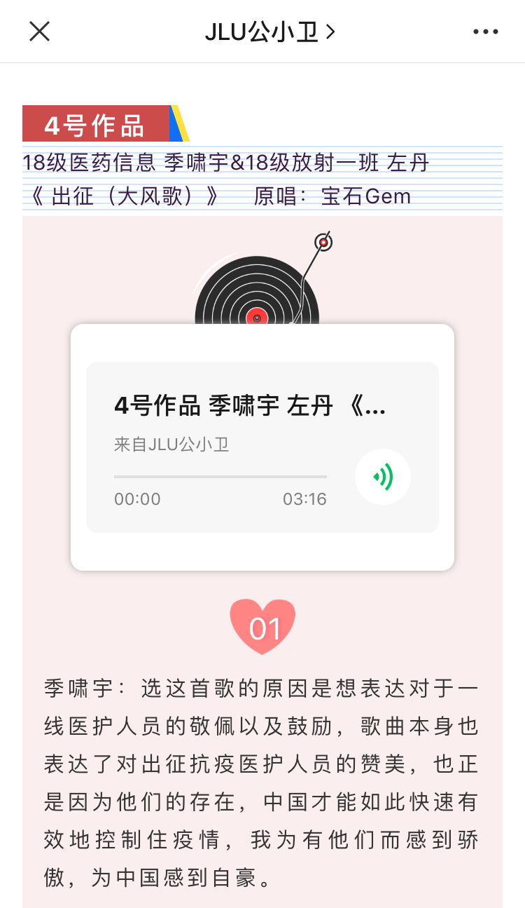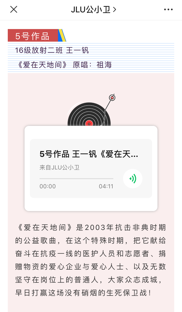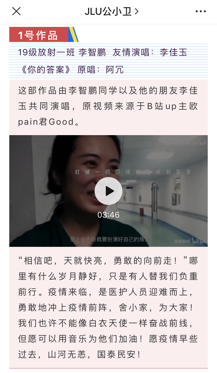 活动前期,参与报名的同学需自行选择与抗击疫情主题相关歌曲,并录制歌曲的音频视频。歌曲要求内容积极向上,符合抗疫主题,传递正能量。该活动得到了同学们的积极响应,他们热情而真诚地演绎了自己的作品。他们的歌声中无不饱含对国家、对世界战“疫”必胜的决心,对前线医护人员的敬佩和对患者的祝福。他们青春洋溢的声音正体现了抗疫战役中年轻一代的力量,展现了作为国家医疗队伍储备军的医员工的青春风采。其中,有10名同学的作品被评选为优秀作品,并在微信公众号“JLU公小卫”上进行了展示,赢得了老师和同学们的一致好评。