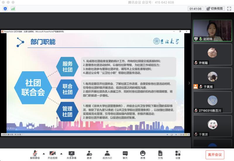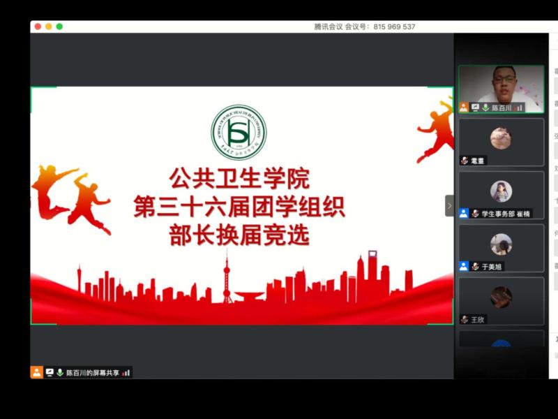 之后,公司分别于5月25日和5月28日在线举行了第三十六届团学组织部长、部员换届大会。各部门参选成员从总结工作经验出发,阐述了自身优势,并对未来工作发表了展望。结合在线投票结果,经公司研究决定,第三十六届团学组织主席团及成员名单在公司微信公众平台予以公示。