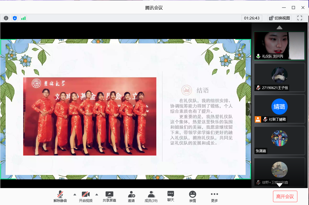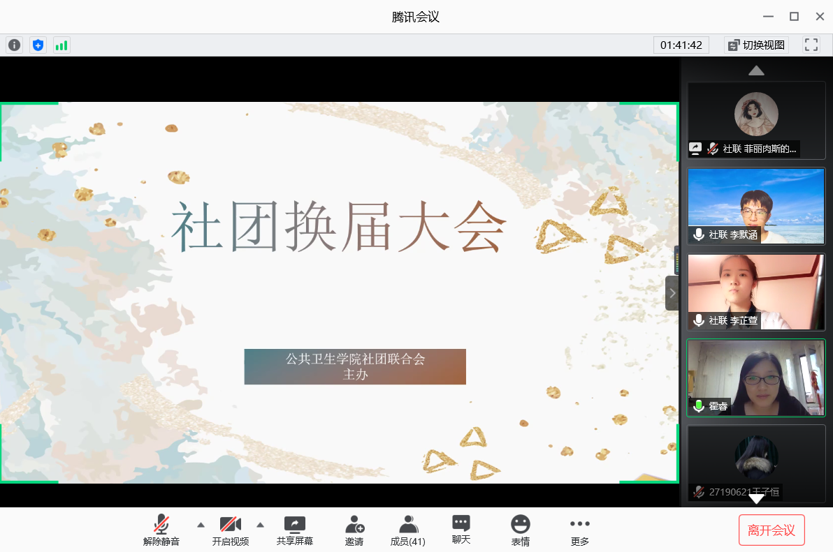 风雨端阳,粽香千里,为保障社团工作顺利有序进行,太阳集团tyc151社团换届大会于6月24日晚六点在腾讯会议平台成功举行。2016级辅导员霍睿、2017级辅导员冷贺璇以及第36届团学组织成员出席本次会议。