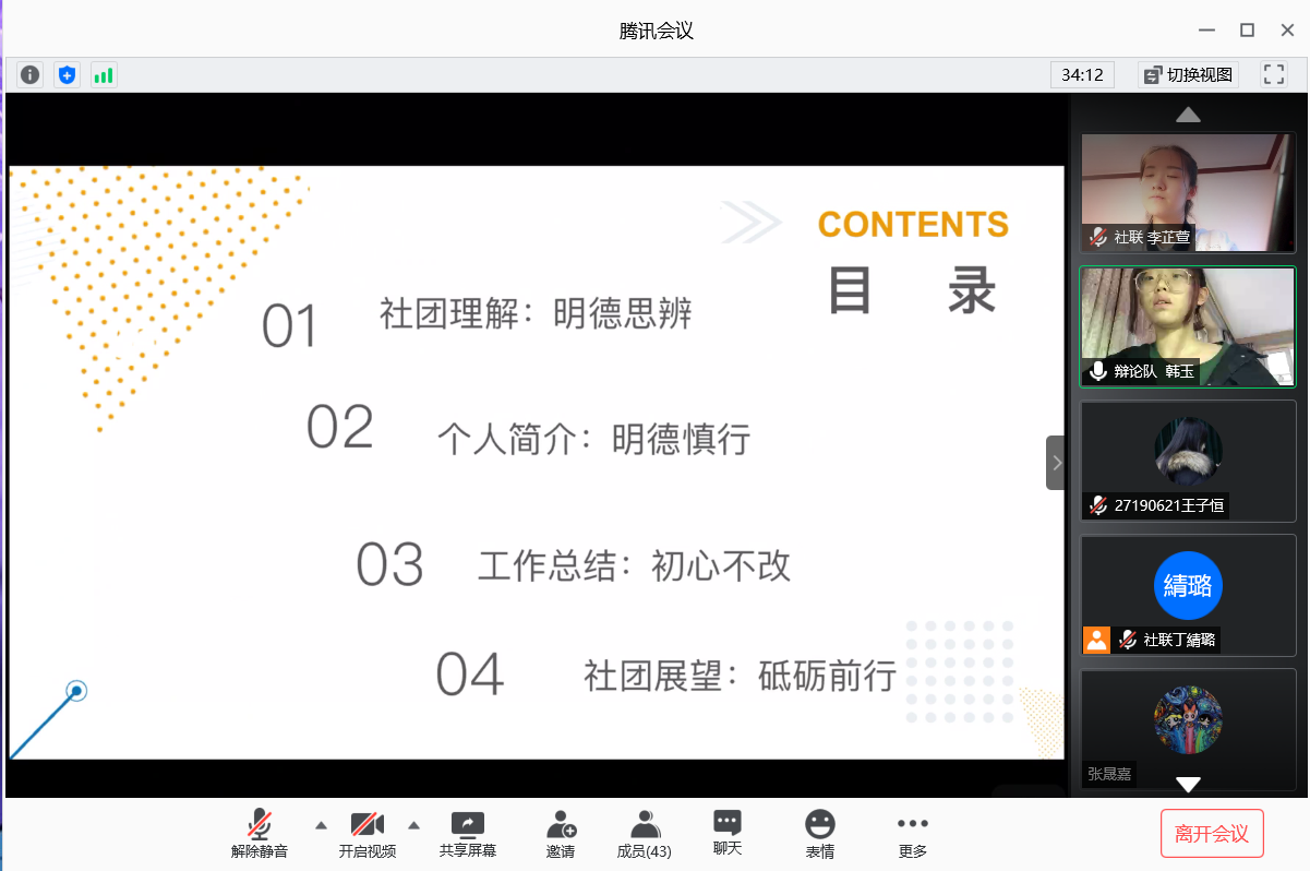 会议分为两个议程。第一议程由来自绿野环保协会、礼仪队、辩论队、主持队、红十字协会、空中英语协会、卫爱志愿者协会七个社团的社团成员参与竞选。在竞选演讲中,竞选人们首先进行自我介绍,讲述了自己竞选的理由以及优势,并结合自己在社团工作中的经验和体悟,对各自社团的未来发展进行了展望。他们勇敢、谦虚,又不失自信,精彩诚挚的言辞令同学们不禁为他们送去一阵阵“掌声”。随后,在第二议程中,由霍睿老师做总结发言,她首先预祝同学们端午节快乐,接着鼓励各社团成员们,即使是在疫情环境下,也要尽可能多举办一些新颖的线上活动,充分调动同学们的参与热情,提高社团影响力和凝聚力。霍老师还对竞选者的竞选发言提出了表扬,同时指出大家的演讲还有提高的空间,要多找自己特色之处。至此,社团换届大会圆满结束。