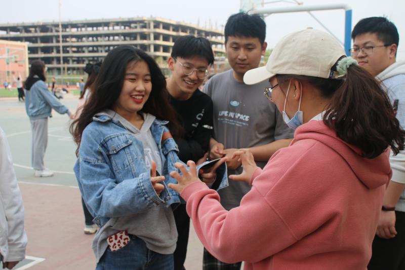 活动分为三大组,即大一、大二、大三依次进行游戏。活动开始,先由各队派选一名同学抽签,决定本队将进行红黑哪条线路。之后,各队分别派选一名同学进行第一项游戏“斗鸡”的挑战,获胜的队伍可以提前三分钟出发。决出胜负之后,两个获胜小组便继续进行下一项的任务。红色线路的游戏依次为“爱学习”、“吹气球”、“打卡片”、“肢体传声”、“跳房子”和“编花篮”;而黑色路线的游戏依次为“听歌识曲”、“呼啦圈”、“小孩老虎枪”、“你画我猜”、“两人三足”和“编花篮”。各小组成员在进行游戏时好像八仙过海,各显神通。有人猜题机敏迅速,有人呼啦圈转得又快又好,有人打卡片一下一个准儿,有人听歌秒识曲……尤其是最后一项“编花篮”,需要同学们极强的团队合作能力,小组中任何一个人出现问题都无法完成游戏。尽管有的同学已经累的满头大汗,但还是坚持了下来。最后,工作人员为大家合影留念,本次活动圆满结束。