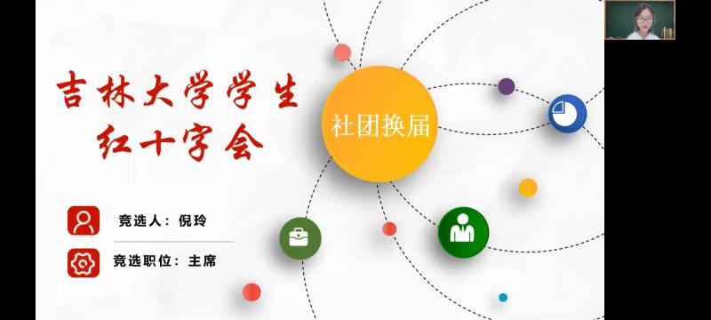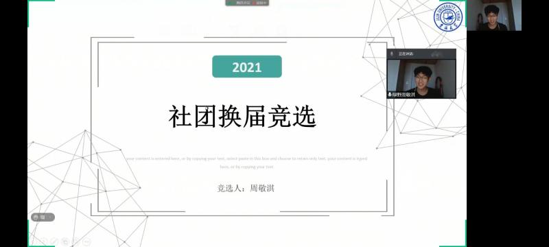 首先,由主持人宋雅萌和张晶介绍到场嘉宾并且介绍竞选规则。随后各个社团主席、队长竞选人员按照先定顺序依次打开屏幕共享配合PPT进行竞职演讲。竞选者们大多从个人简介,工作经历,个人优势和未来展望四个方面展开演讲。每位竞选者的演讲都十分精彩,他们回顾了过去一年在太阳集团tyc151的工作经验,并提出了对各社团未来的殷切期望。竞选演讲结束后评委嘉宾为各个竞选者打分。最后,评委嘉宾们在QQ群中进行投票,并由社联工作人员进行统计最终的结果并公示。于此本次社团换届大会圆满结束。