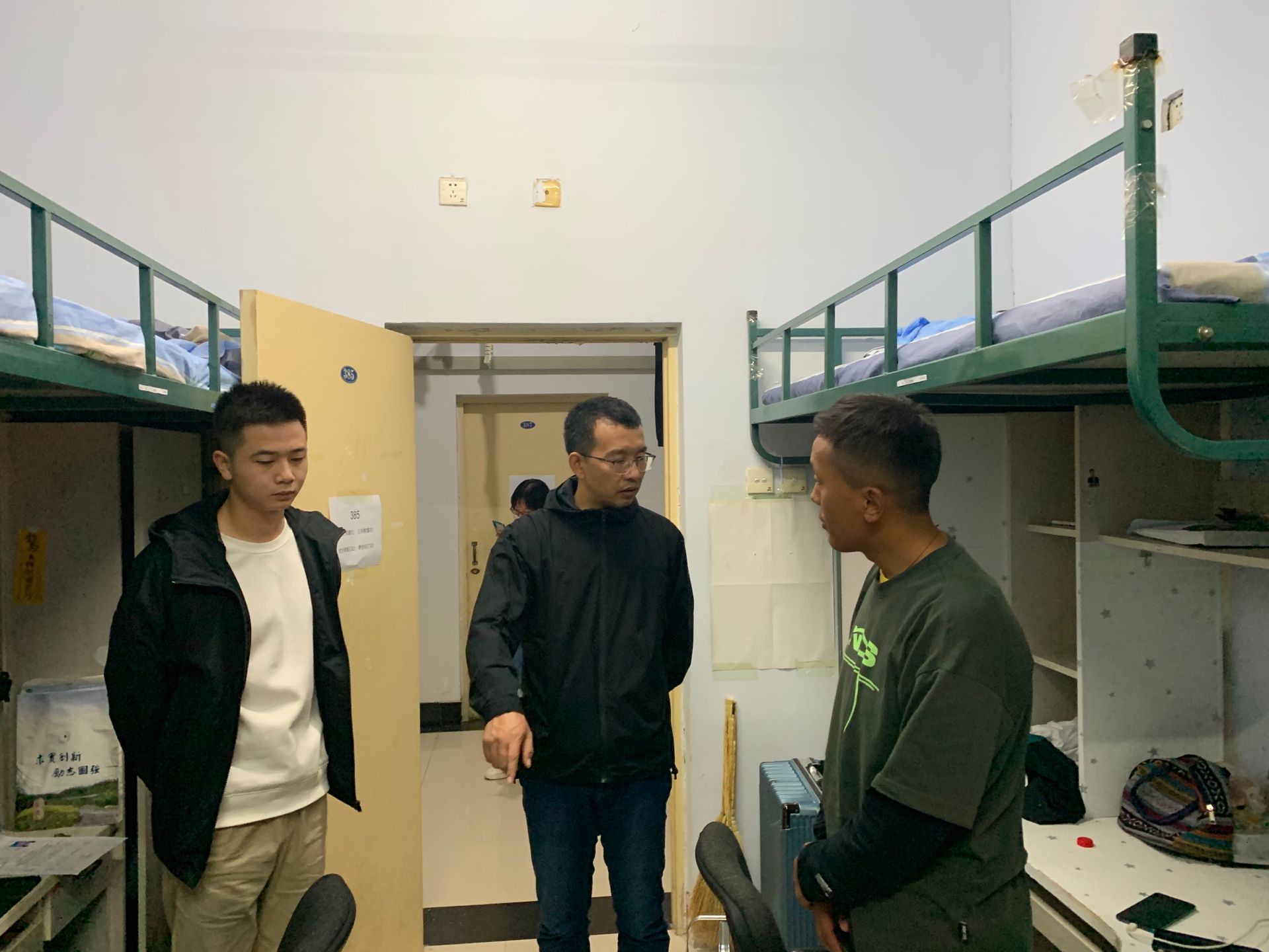 苏国范老师走进寝室,了解同学们的生活状况,并针对如何处理寝室关系,如何快速融入班集体,以及如何适应老员工活等提出了宝贵意见。同学们十分认真的听取了老师的建议。在此次查寝的过程中,苏国范老师与同学们进行了友好的交流,了解同学们的学习和生活,家乡在哪里,让本地同学尽地主之谊,帮助外地同学快速的融入宿舍生活,并提醒男同学不能天天打游戏,要平衡学习和生活。并且对于评选经济关注对象等事宜进行了讲解,鼓励家庭困难的同学了解并申请经济关注对象。