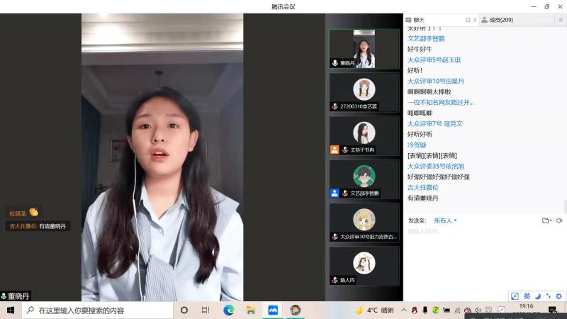 3月27日晚18时30分,“公卫好声音”决赛。海选中脱颖而出的8位优秀选手在本次决赛中大展身手,进行才艺比拼。公共卫生公司党委副书记刘金超,辅导员苏国范、冷贺璇、刘心怡参与活动,团学组织成员及各班员工代表作为大众评委积极为各位选手加油助威,200余名各年级员工观众在线观看直播活动。