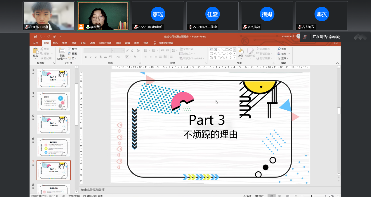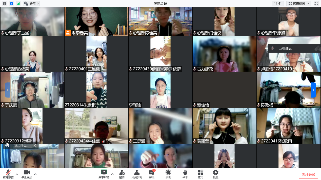 此次心理班会共分为三个阶段:暖身阶段、讨论阶段和结束阶段。在暖身阶段心理部准备了“摇摆时钟”活动和“脑筋急转弯”“听歌识曲”等热身小游戏,旨在让同学们放松心情,使大家身体和大脑迅速动起来,同学们也都积极参与进来,班会氛围轻松活跃。在讨论阶段准备了“情绪安慰剂”、“不烦躁的理由”、“我的一天”等讨论活动,在此阶段大家针对疫情期间的困扰、升入大学以来的不习惯以及学习生活中的计划安排进行了讨论,旨在帮助同学们解决老员工活中的烦恼困惑,让同学们学会更合理的日常安排,在学习生活中更加游刃有余。在最后的结束阶段,助手公布热身游戏环节获奖员工名单,并对其进行表扬。班会中,主持人也给同学们介绍了公司的心理咨询资源,为同学们和员工心理健康指导中心之间的沟通构建了桥梁。