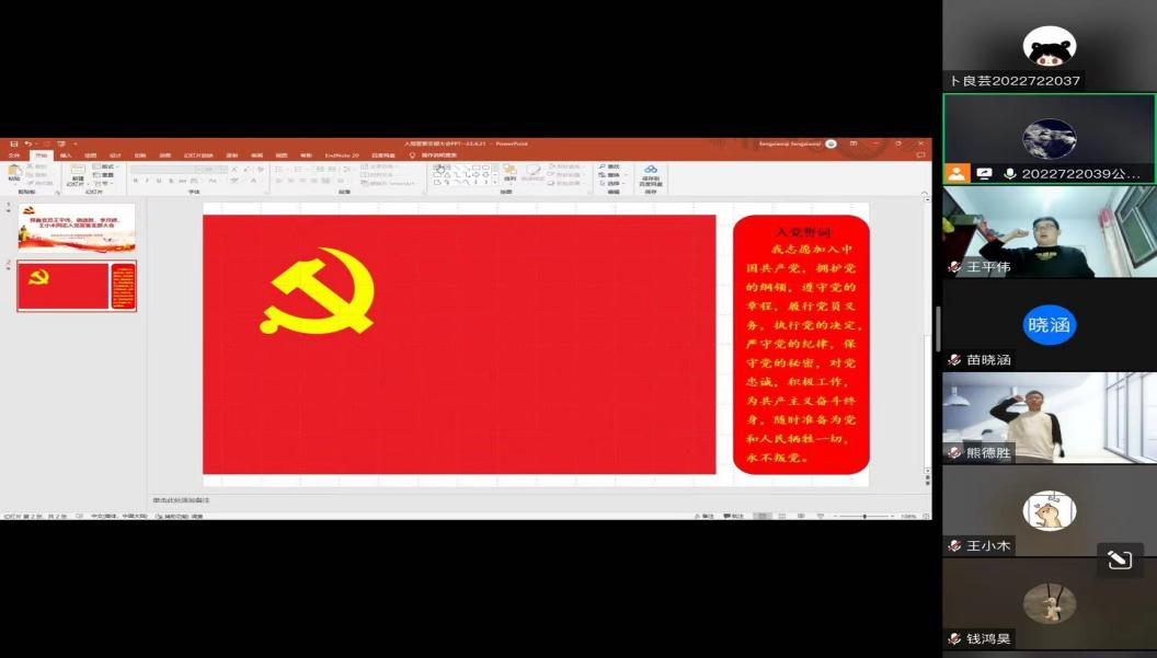 接下来,党支部采取线上线下同步的方式,在各支部支委的带领下,新发展的预备党员面向党旗,高举右拳,进行了入党宣誓。宣誓仪式后,支部党员代表进行发言,他们表示欢迎各位新发展预备党员加入党支部这个大家庭,希望在今后的学习生活中,大家互帮互助,共同进步,共同推进支部建设,切实发挥出党支部的战斗堡垒作用,更好地为老师和同学们服务。