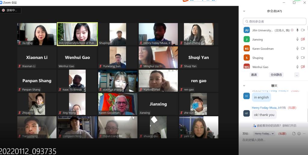 At 9:00 a.m. on January 12, 2022, the project of "Global Competency Improvement Plan for Jida Students - Winter Holiday Course Training Plan" held by the School of Public Health of Jilin University was officially launched on the ZOOM platform. The project aims to broaden students' international vision, help students improve the application of research methods and the cultivation of scientific research thinking, and meet the international needs of public health talent training. It sets the core content of the course from the aspects of scientific and technological paper writing, global health socialization trend, etc.